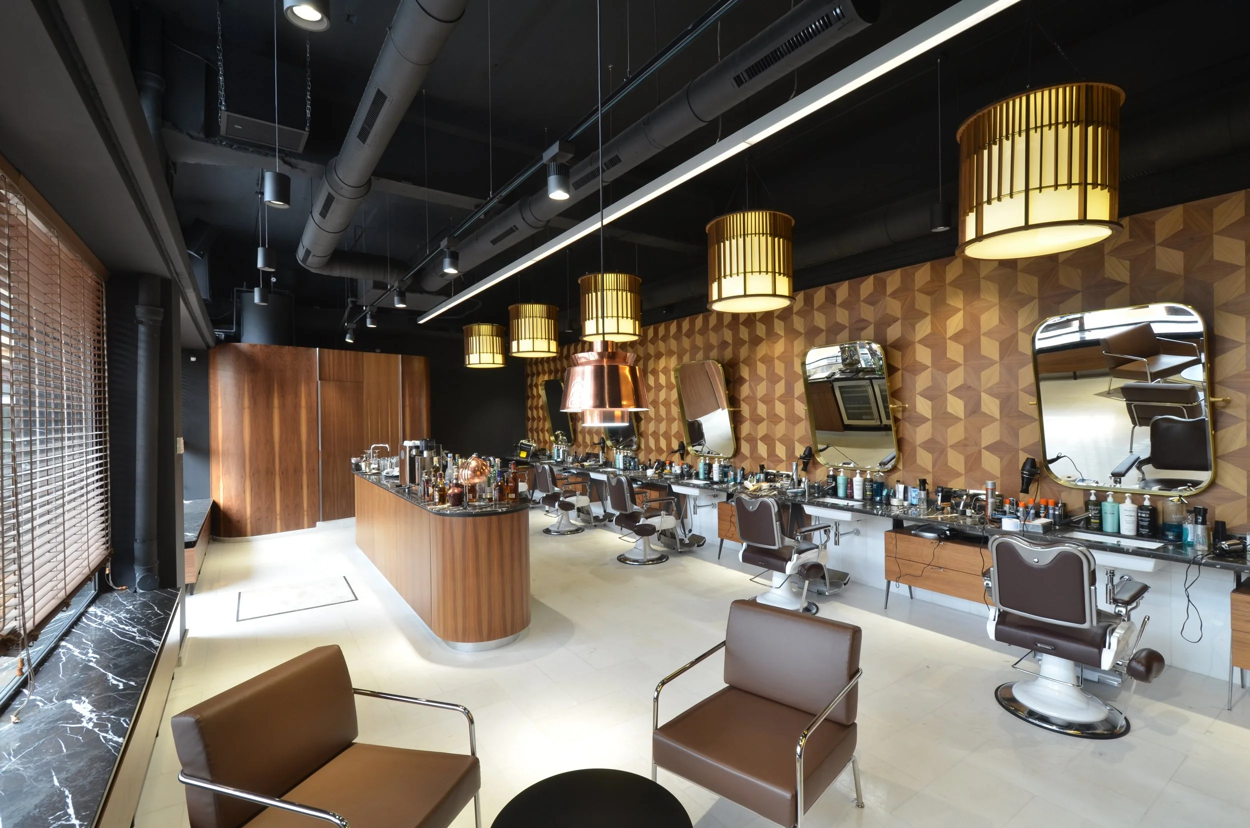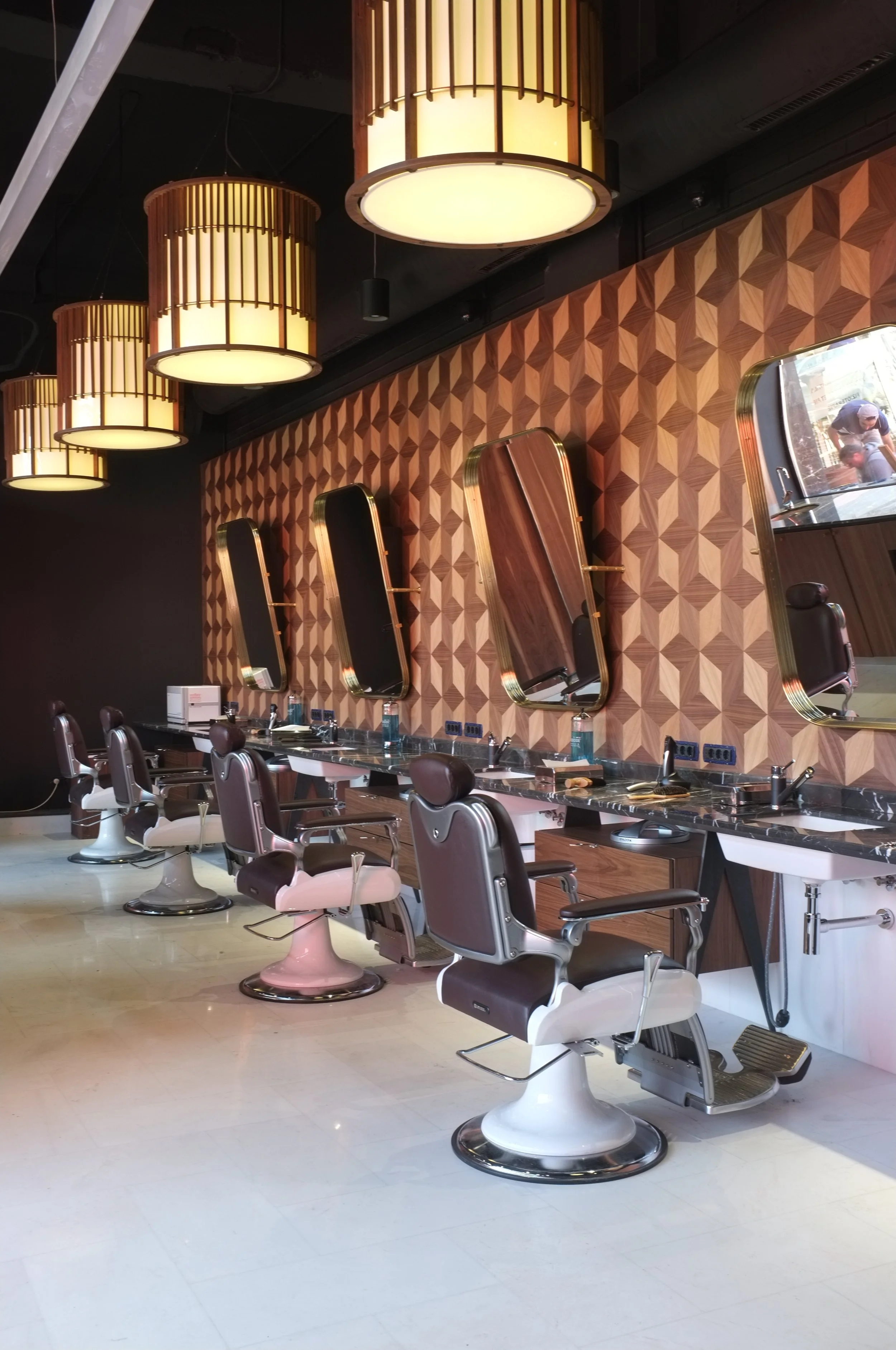 Veneered walls adorned with Japanese patterns and stylish pendants pay homage to the origin of the Takara chairs, Japanese steel razors, and scissors found within BRICI. These Japanese motifs seamlessly blend with the Art Deco aesthetic, embodying a sense of precision often sought but sometimes lacking in traditional barbershops.