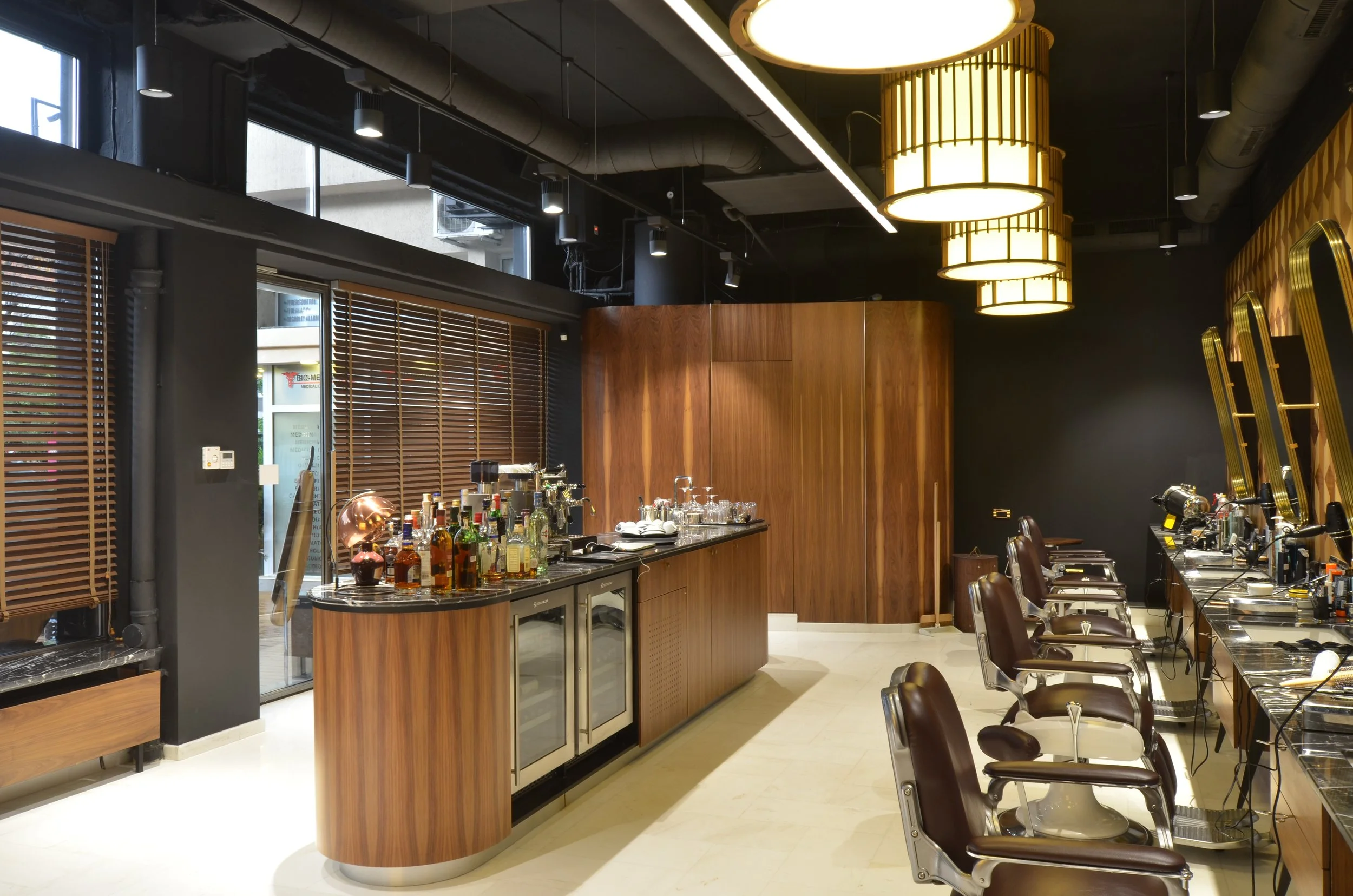 The interior design and logo draw inspiration from the Art Deco era, particularly the golden age of barbershops characterized by intricate luxury. During this period, barbershops were not just places for grooming but also served as cool hangouts for men, rivaling saloons in their socializing function. In BRICI, a central bar takes the spotlight, embodying the social essence of those bygone barbershop days.